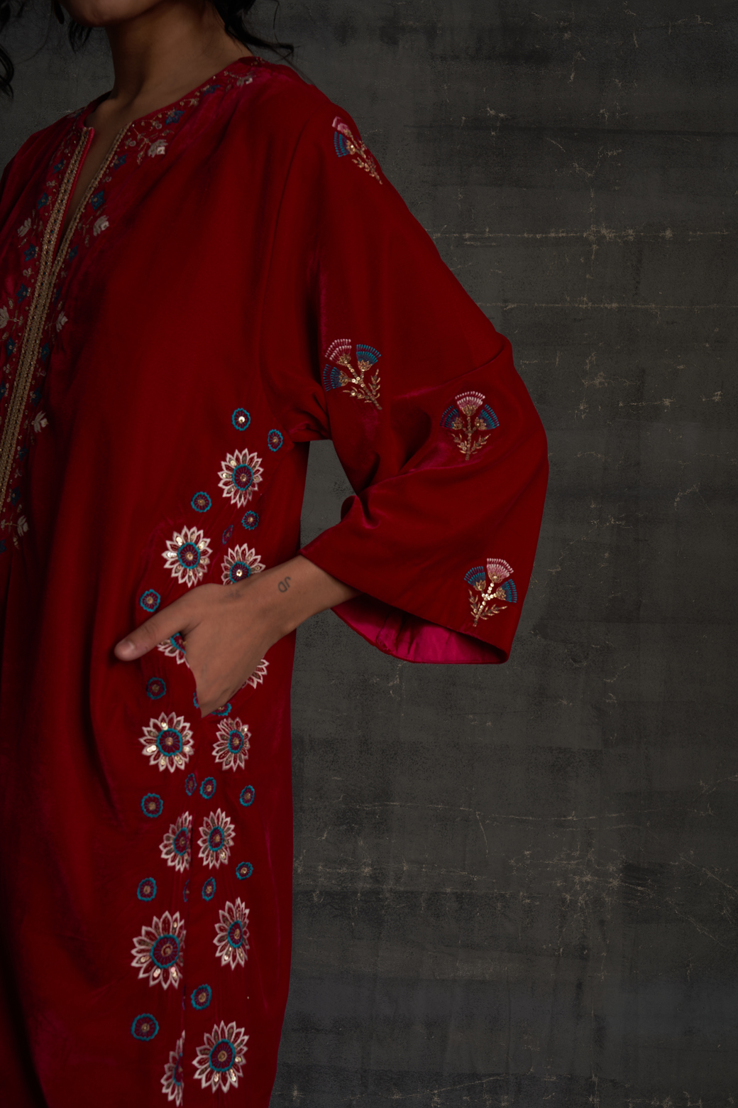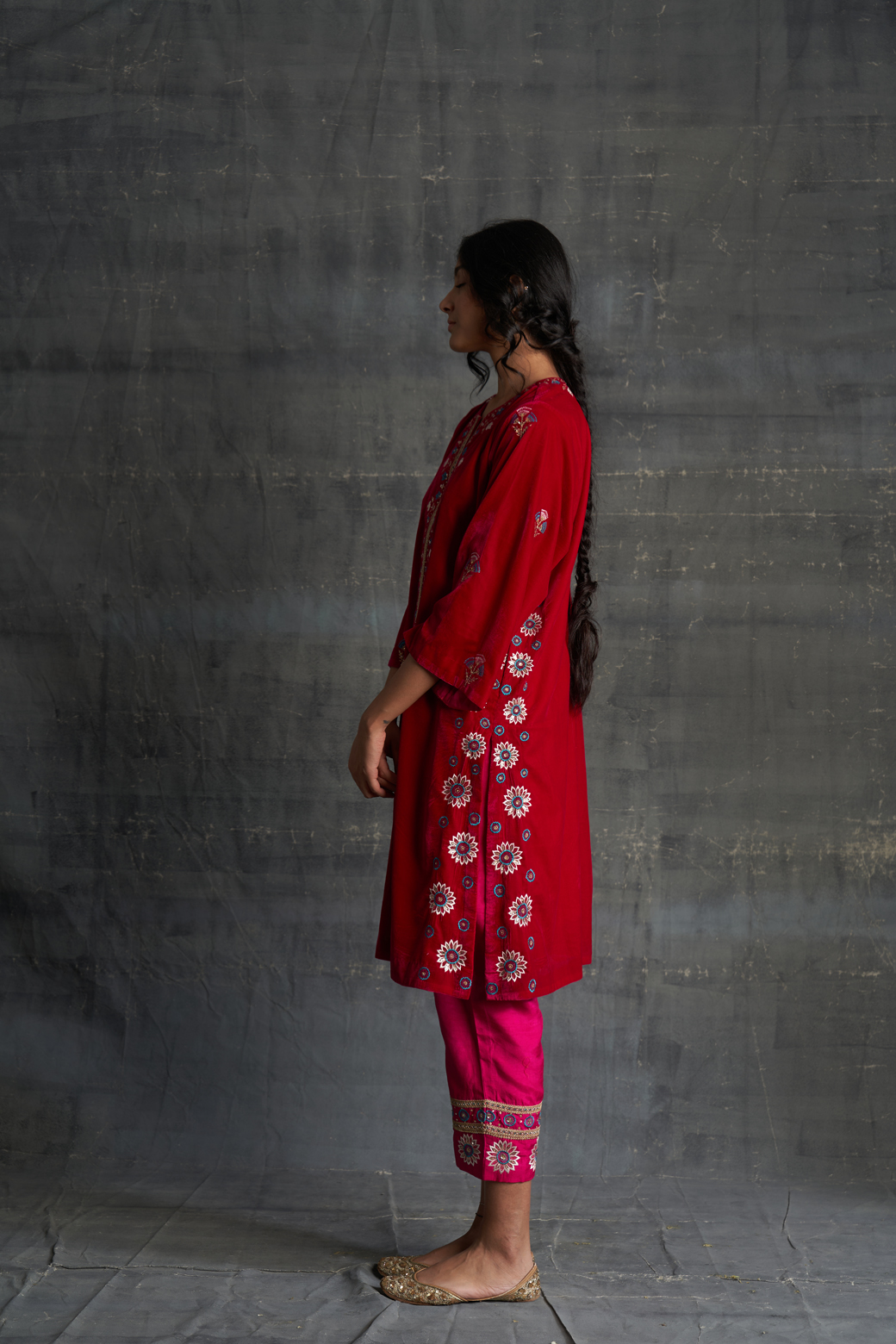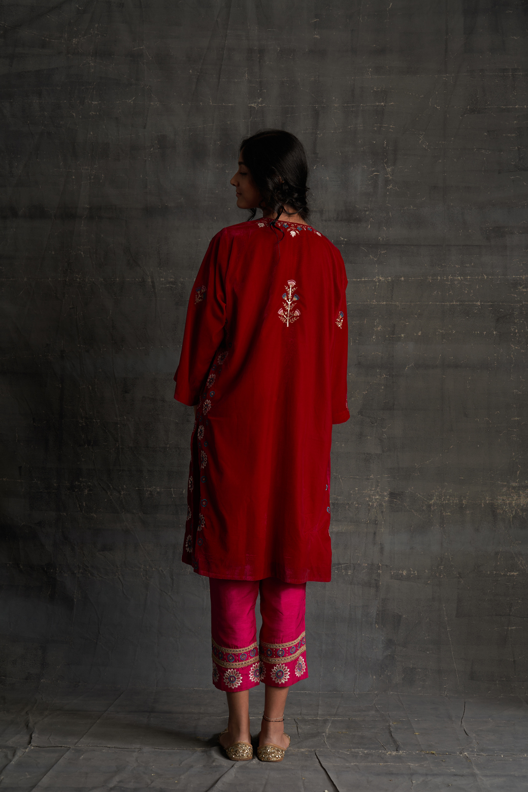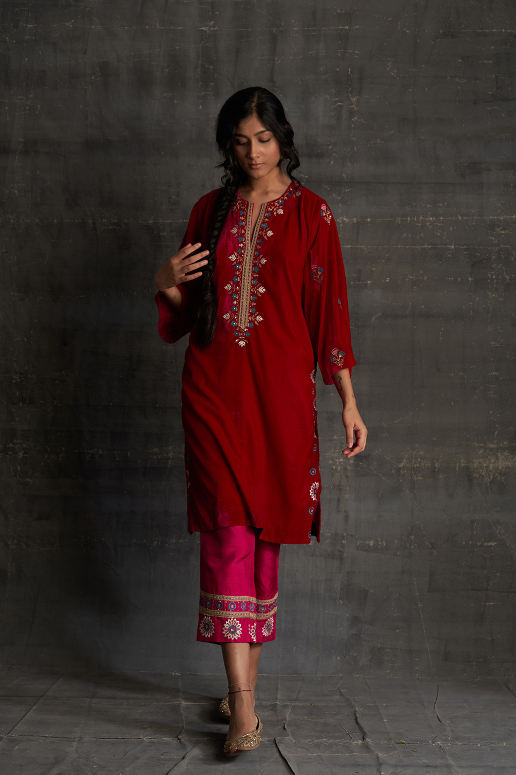Description : Magenta velvet kurta floral embroidered with zari and multicolor resham thread and highlighted with sequins, paired with pink rawsilk pants.