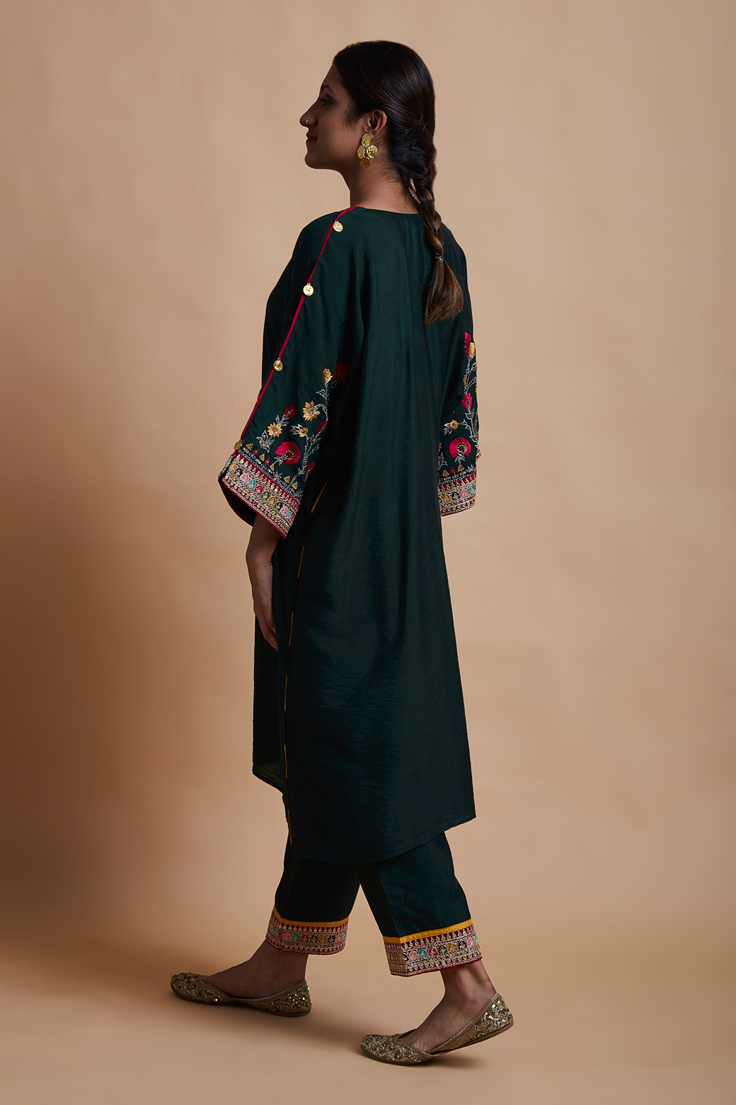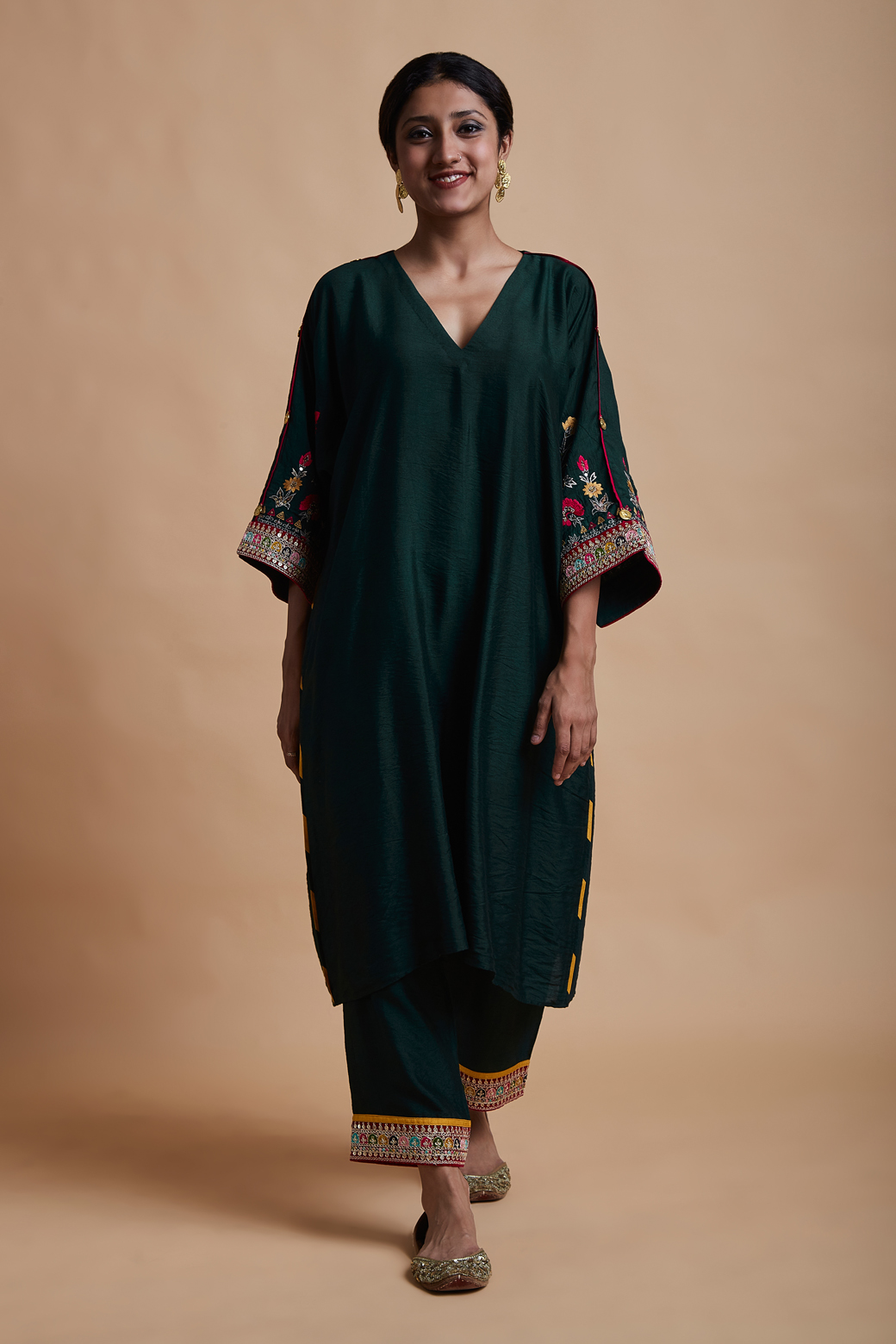 Description : Emerald green flax cotton kaftan, floral embroidered at sleeves with zari and resham thread, highlighted with sequins, comes with matching pants.