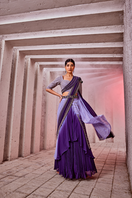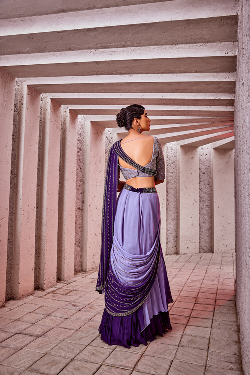Description : This lahenga saree features a beautiful violet ombre color , transitioning from deeper shade at hem to lighter hue. The layered skirt is micro-pleated at bottom.