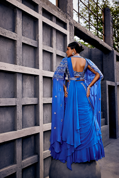 Description : A pre-draped blue lahenga saree accompanied with a floor length cape. the layers in the skirt makes it flawlessly beautiful . the knot work on the sequin enhances the look