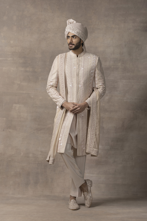 FEATURING DUSTY ROSE SHERWANI WITH THREAD WORK HIGHLIGHTED WITH PEARL AND SEQUIN WORK PAIRED WITH KURTA, PANT, SHOES , DUPATTA AND SAFA FABRIC
