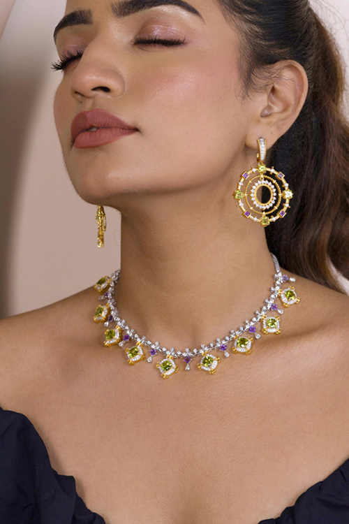 Description : Featuring a Necklace with Natural Citrine, Green onyx, and Moissanite.