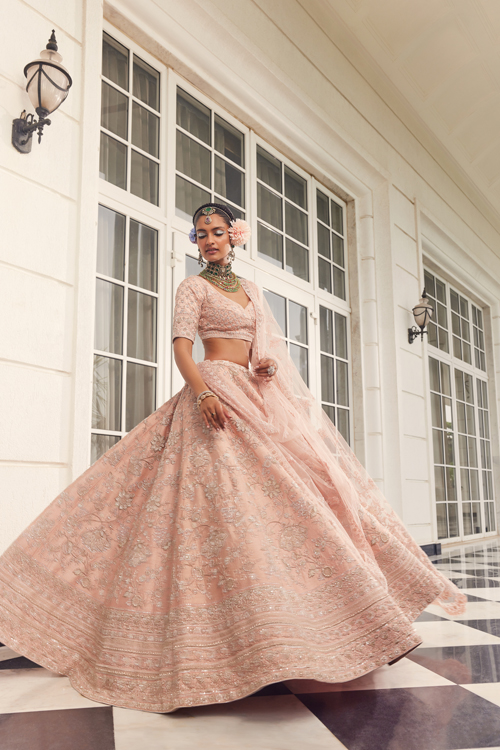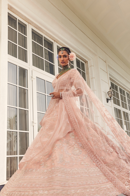 Pink raw silk lehenga with beautiful hand machine embroidery (sequins, cutdana)