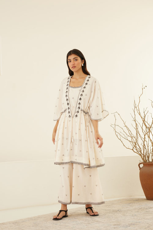 Description : Hand Block Printed Silk Voile Kimono with Jumpsuit