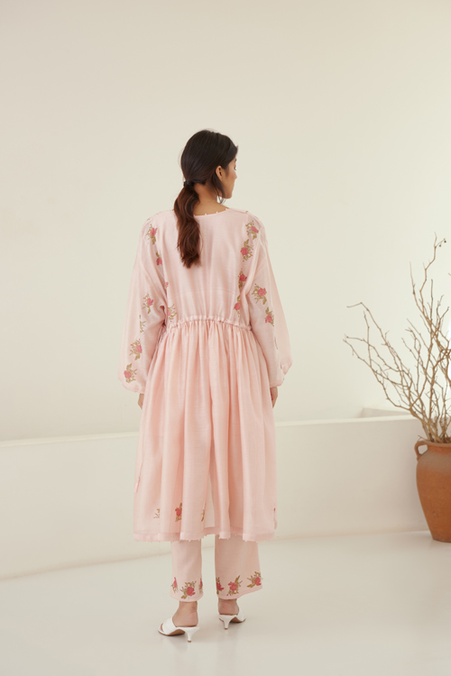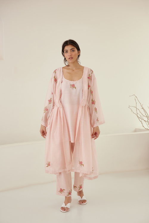 Description : Hand Block Printed Silk Voile Front Open Tunic with Sleeveless Inner Top and Trousers