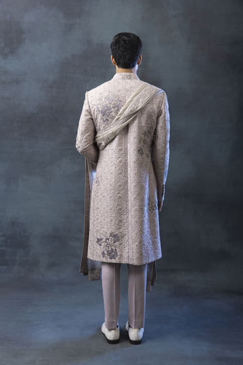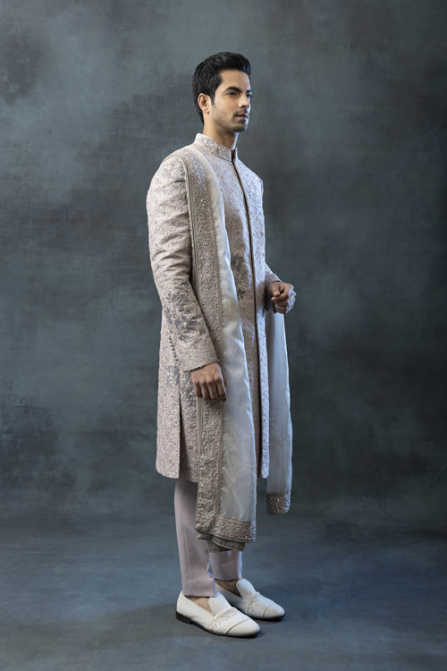 FEATURING IVORY FRONT OPEN STYLE SHERWANI HIGHLIGHTED WITH PEARL AND SEQUIN WORK PAIRED WITH KURTA, PANTS , SHOES,DUPATTA &