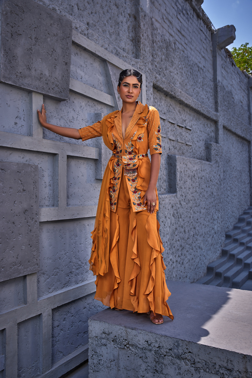 dupatta is designed with lace and ruffle detailing. The belt bag is added to complete the overall look