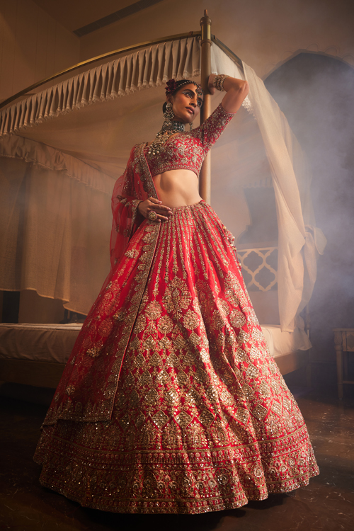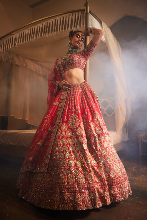 Red raw silk lehenga zardosi and thread hand embroidery all over.