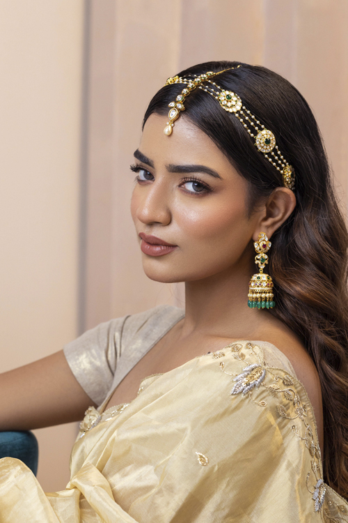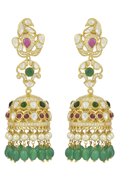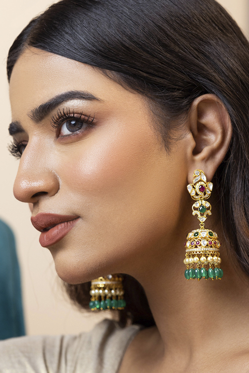 Description : Featuring statement jhumki earrings, perfect for a festive look. It is set with natural green onyx, hydro rubies, moissanite polkis and moissanites.