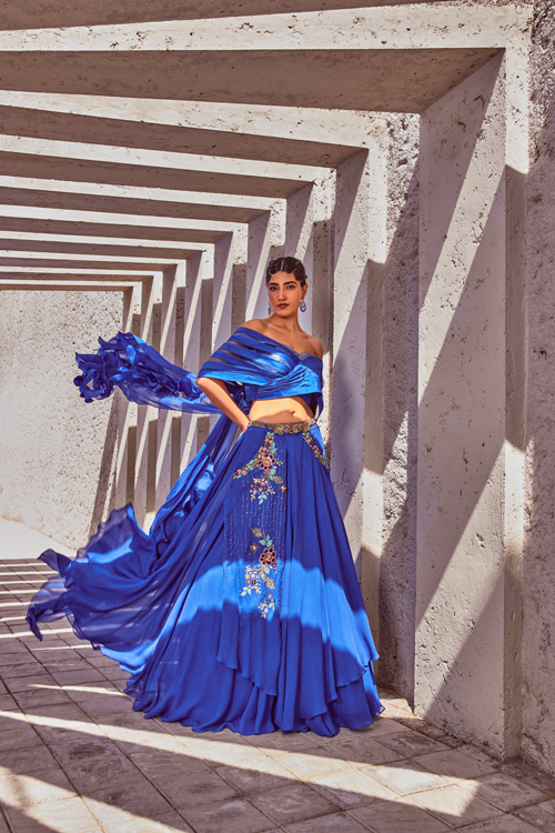 Description : The blue floor length skirt with pockets and layered blouse with its drape of alternating opaque and translucent fabric ( 3D embroidered butterfly and floral motifs on the belt and skirt ) and the trailing details all come together