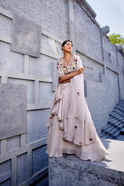 A mullet hem cape enhancing the overall look. The embroidery is inspired by nature which sums up the garment
