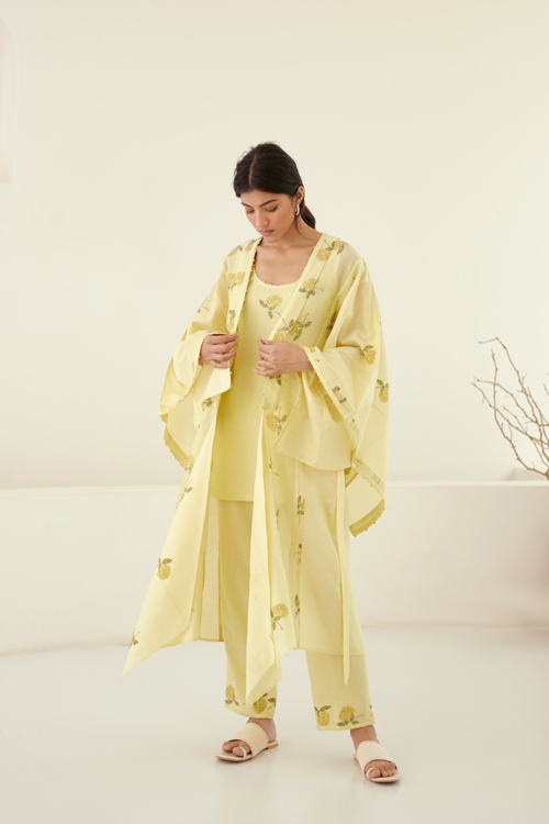 Description : Hand Block Printed CHanderi Long Kimono with Sleeveless Inner Top and Trousers