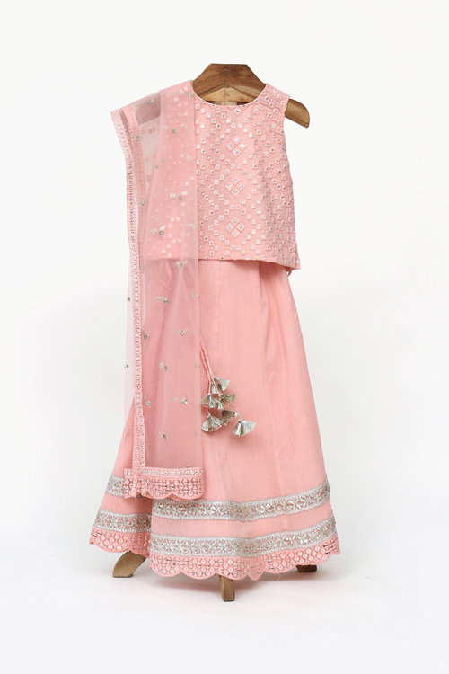 Description : Crushed Cotton embroidered Blouse and Lehenga with Net Dupatta