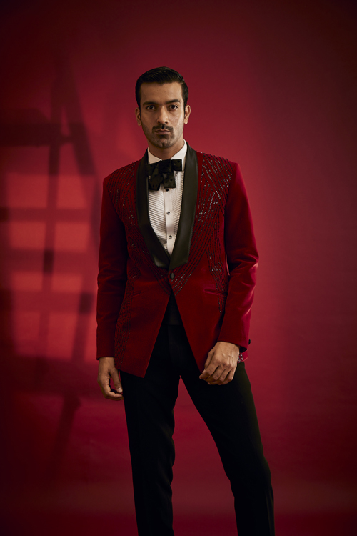 FEATURING IVORY TUXEDO HIGHLIGHTED WITH WHITE PEARL WORK PAIRED WITH WHITE SHIRT , BOW , WAIST-BELT AND PANTS