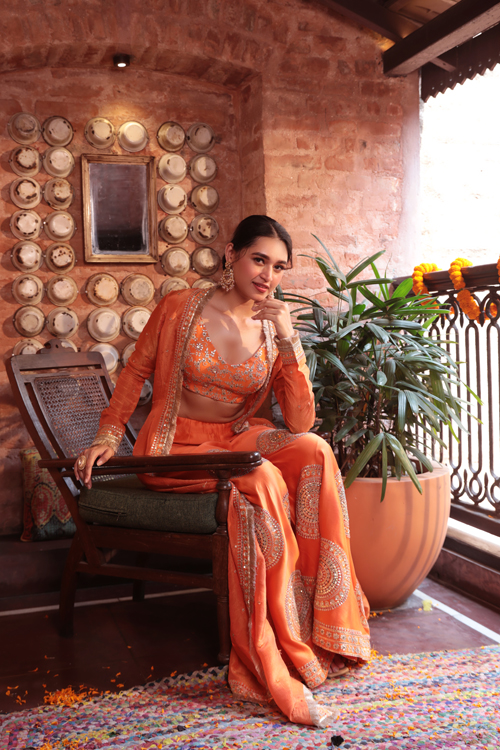 Description : ORANGE TISSUE CHANDERI JACKET SHARARA WITH PURE HAND WORK
