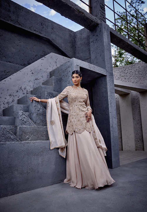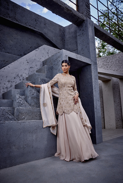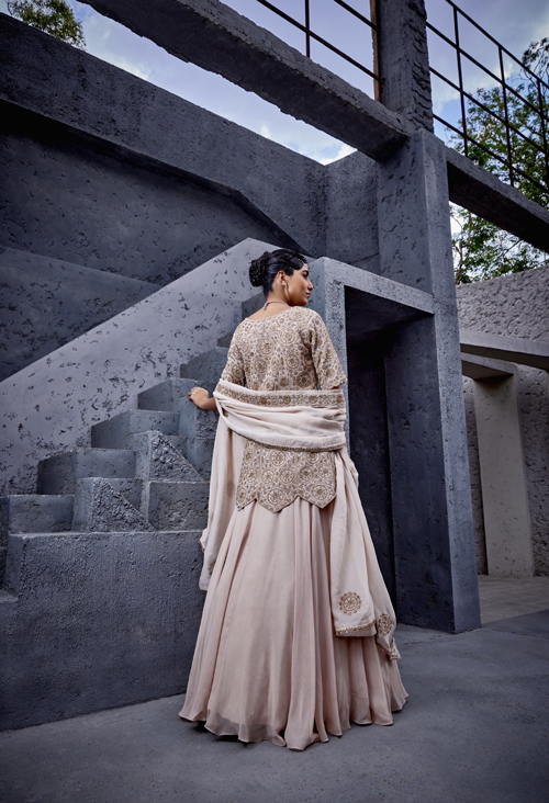 Description : The flared skirt paired with a short kurti having domed hem is a unique ensemble that draws inspiration from celestial elements. The embroidery contains motifs of starts and galaxies. Accompanying dupatta is adorned with a border and has motif spread all over