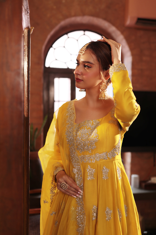 Description : MUSTARD ORGANZA GOTA PATCH WORK SUIT