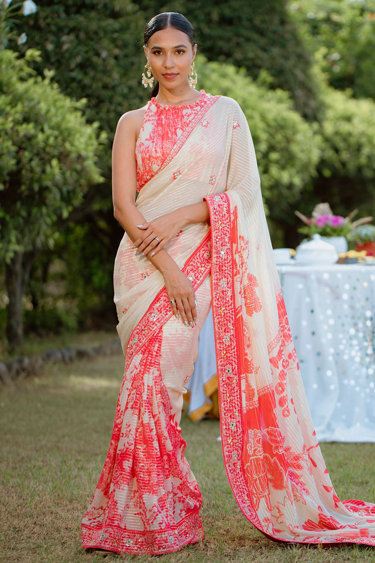 Red Viscose Georgette Digital Printed & Embroidered Saree Set