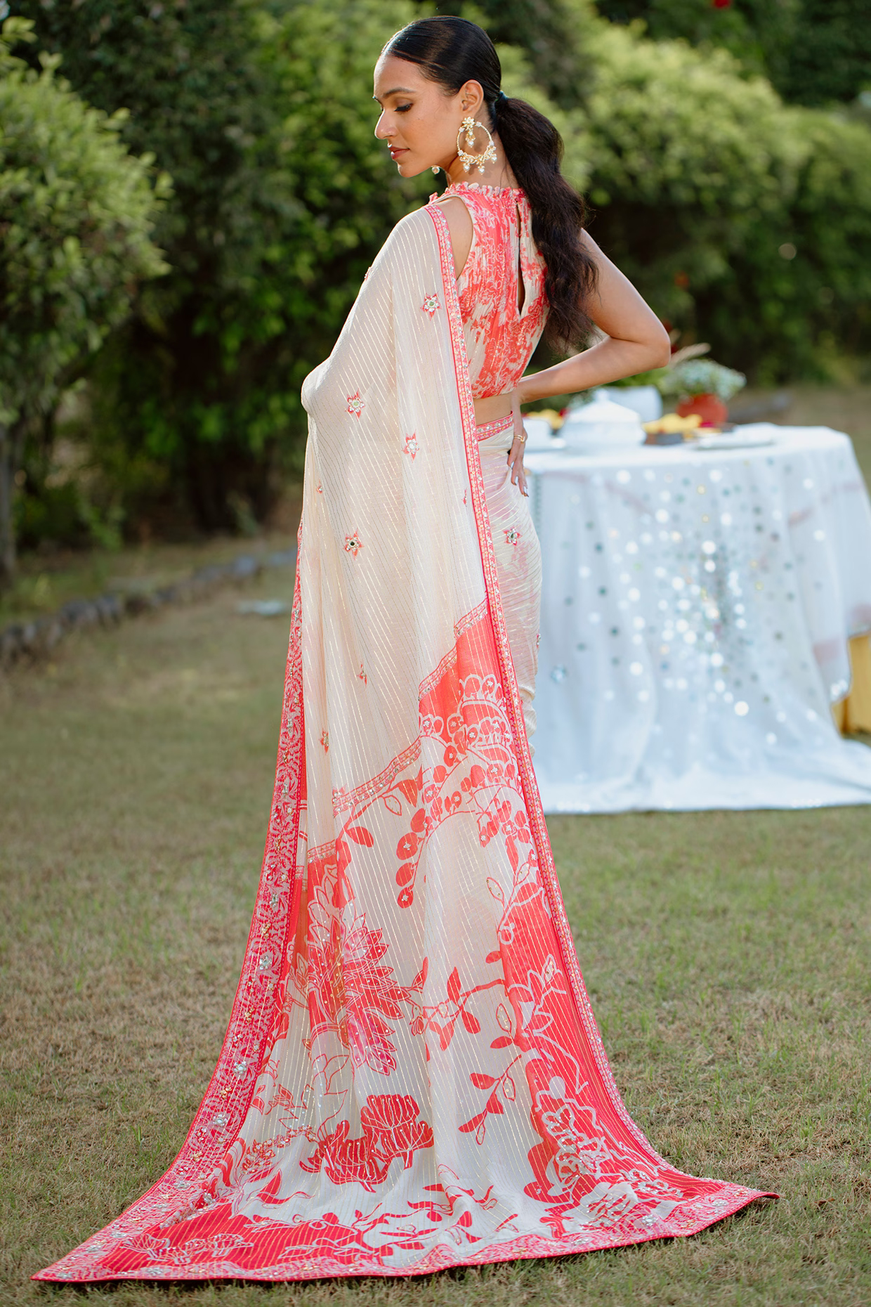 It is paired with a bustier having bell sleeves, mirror, shell and beads hand embroidery, including an embroidered organza dupatta.