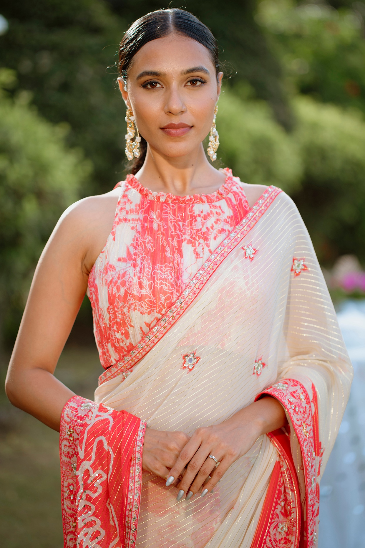 Style this designer lehenga set with dangler earrings and heels for a cocktail ceremony.