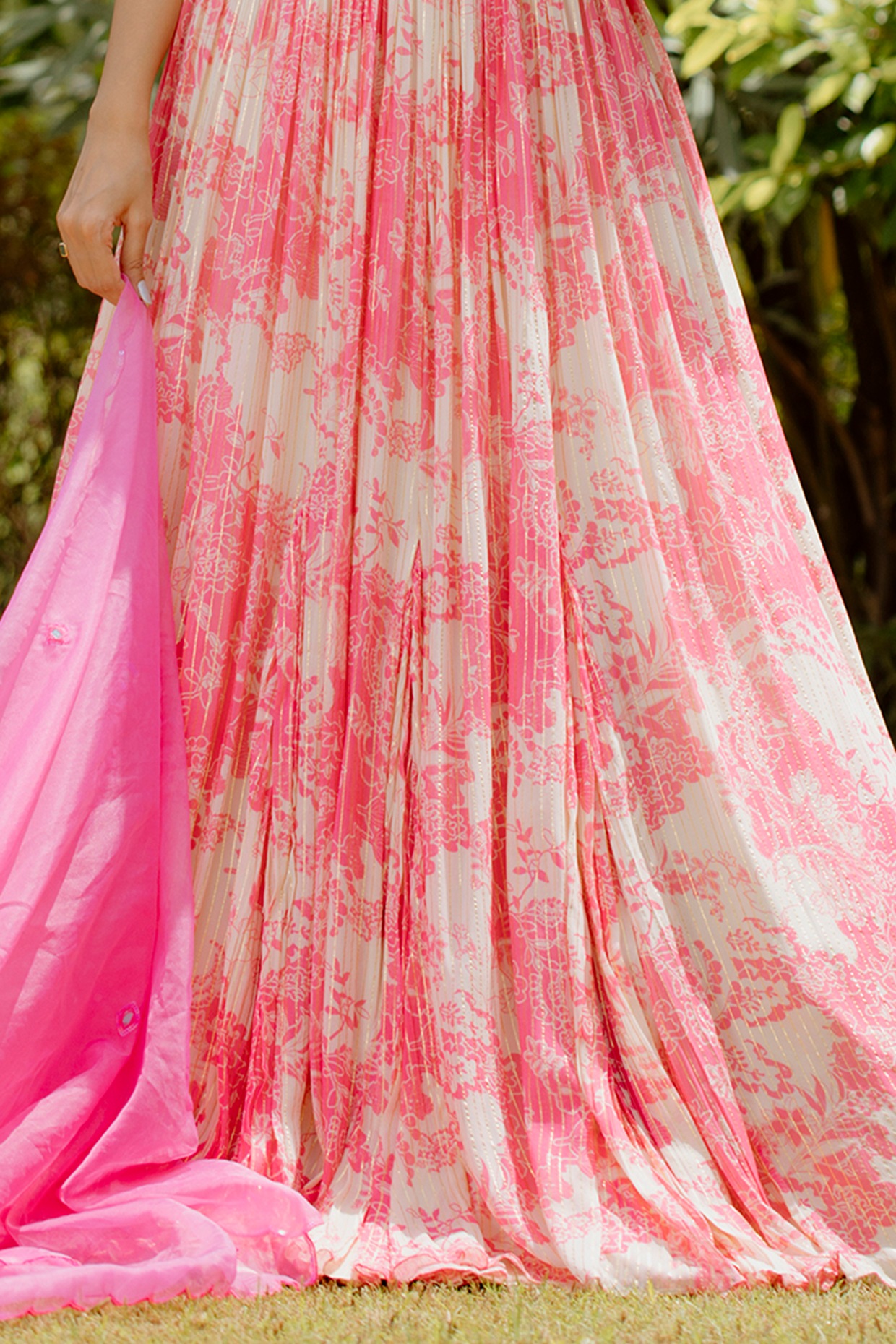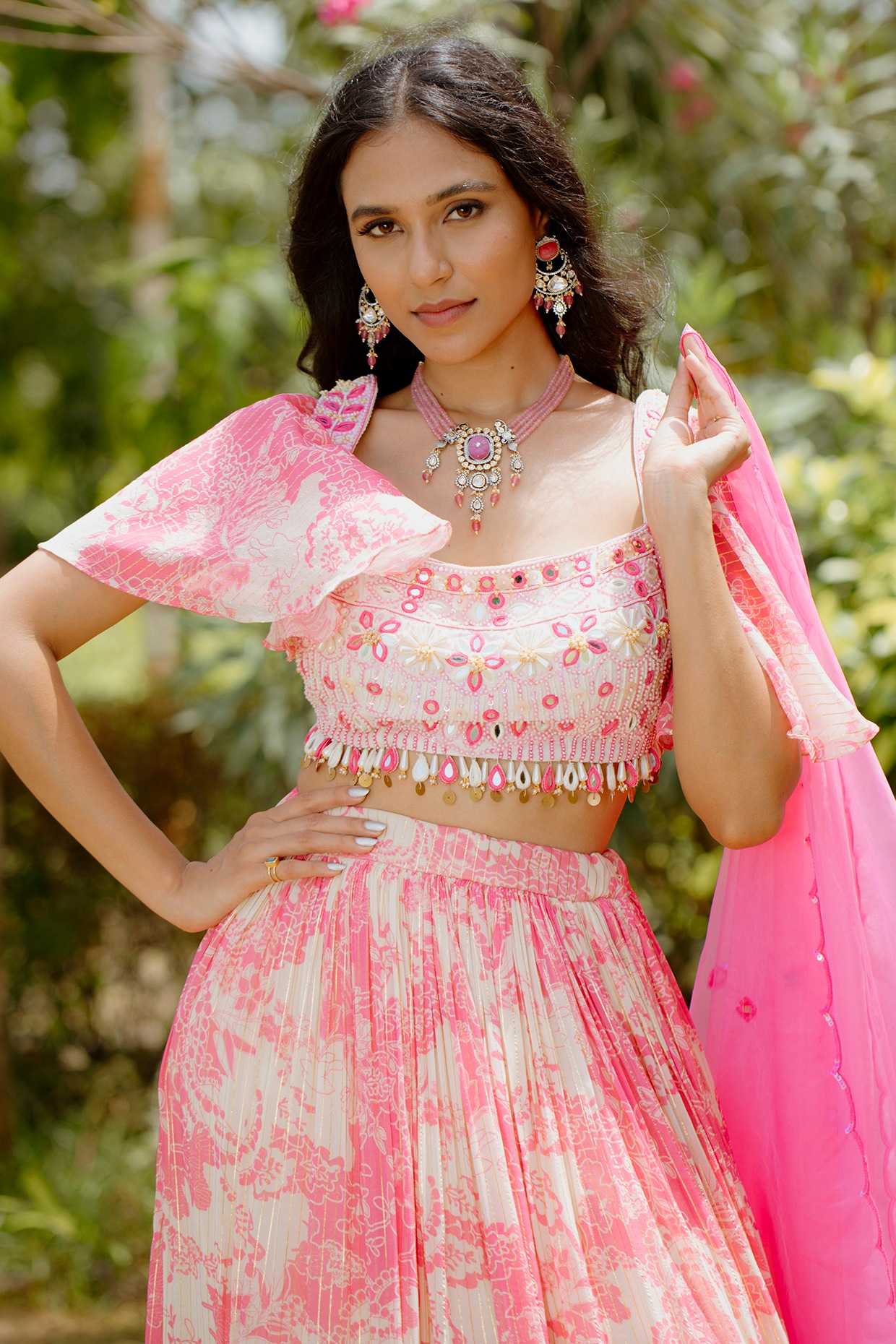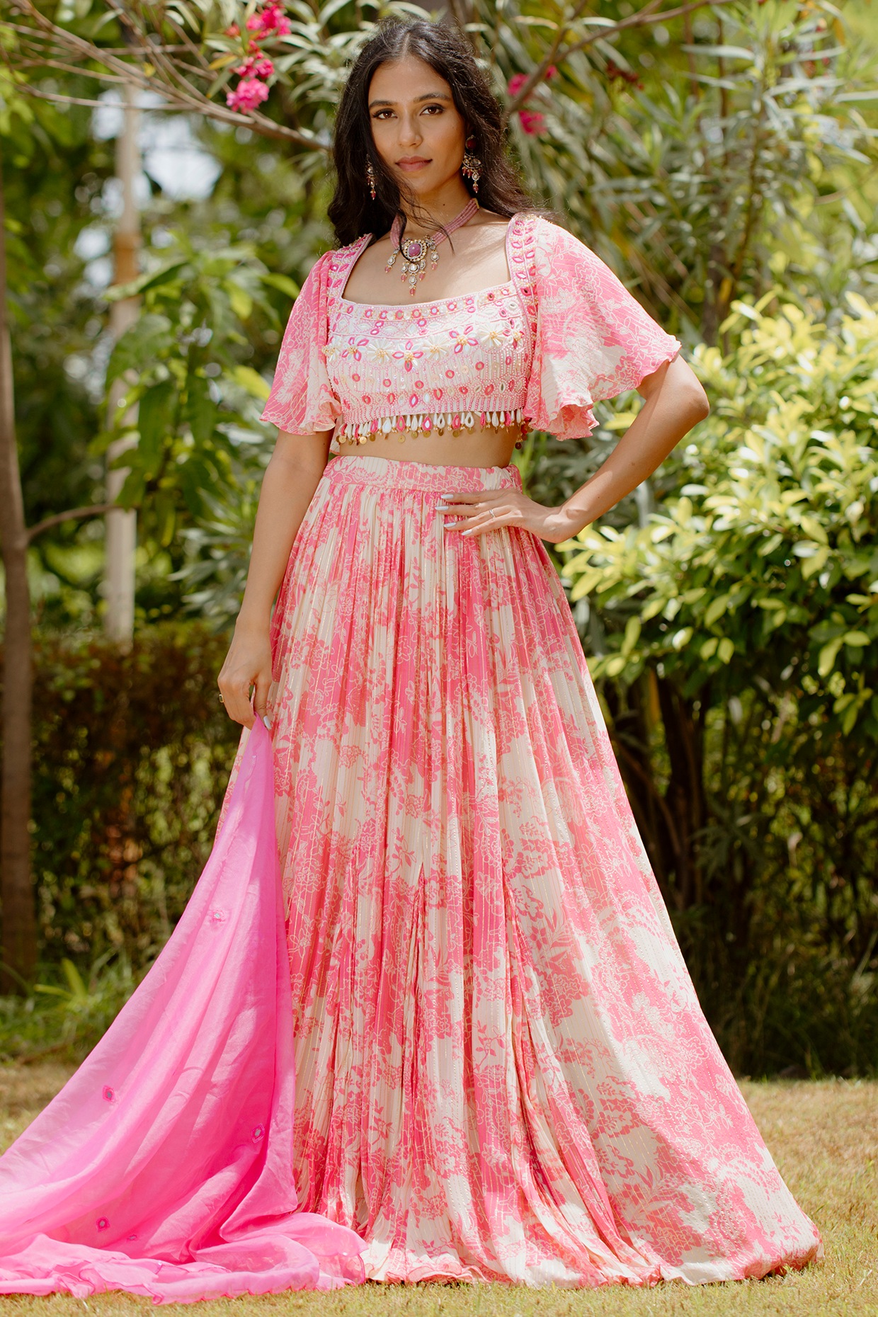 Description Featuring a pink kalidar lehenga in viscose georgette base with digital print.