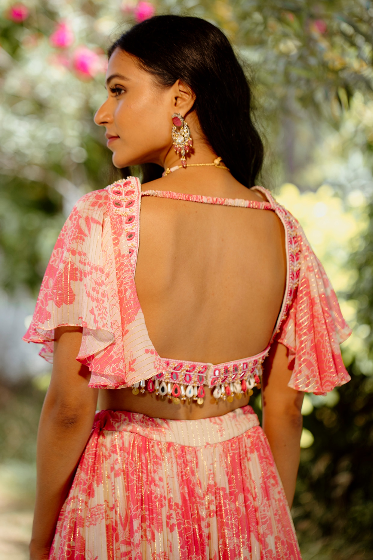 It is paired with a bustier having bell sleeves, mirror, shell and beads hand embroidery, including an embroidered organza dupatta.