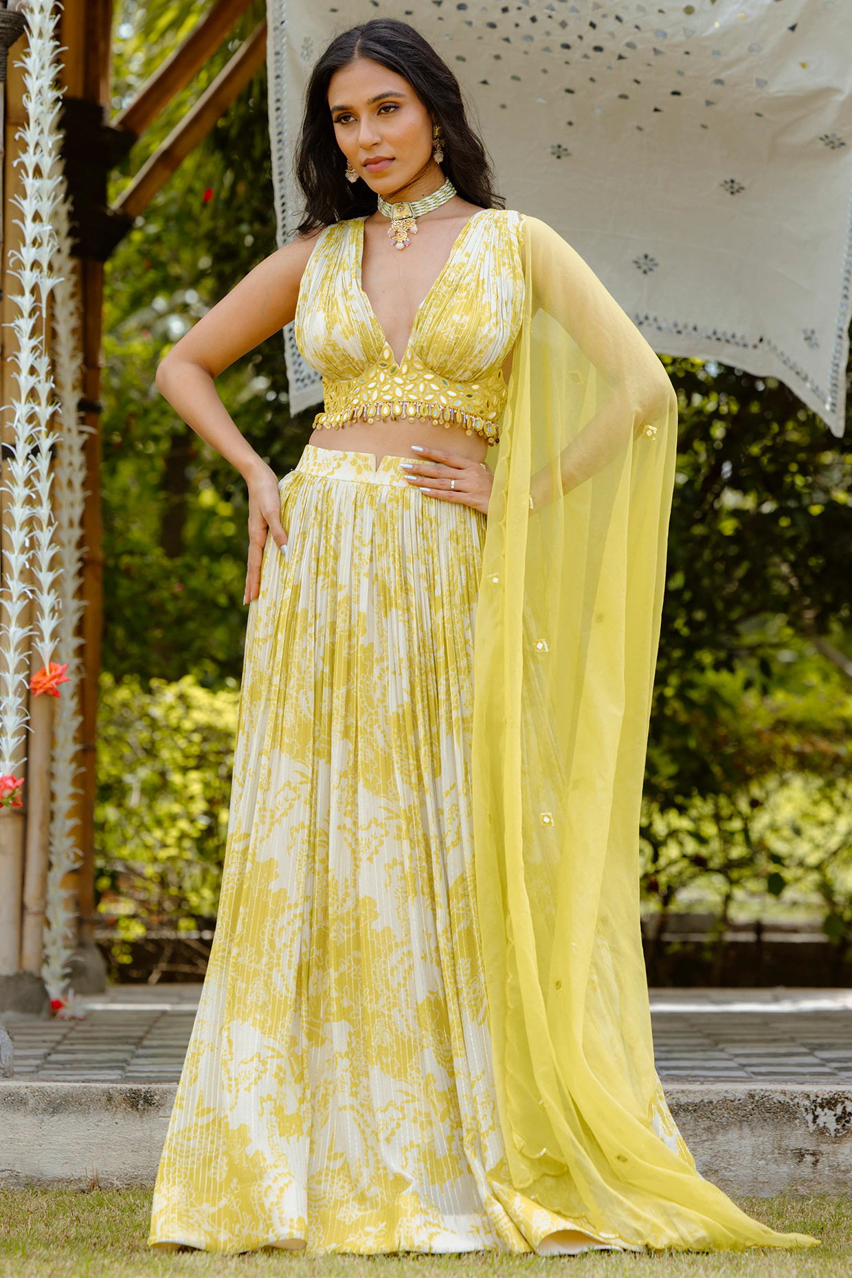 Description : Featuring an olive yellow gathered lehenga in viscose georgette base with digital print.
