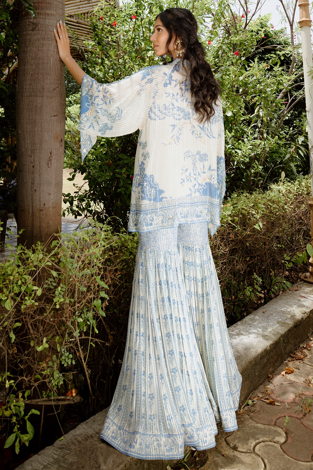 including digital print. It is paired with sharara pants. Style this designer sharara